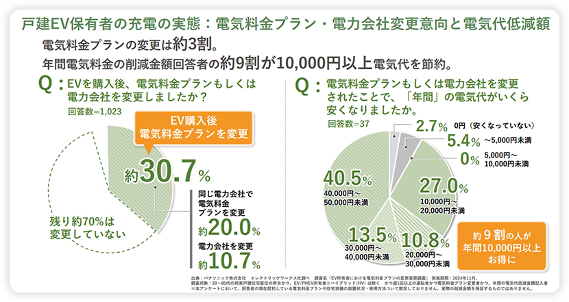 ほとんどのEV車ユーザーが自宅で充電(約86%)をしています。 そして、戸建てEVオーナーの約3割は、EV購入後に電気料金プランや電力会社を見直していることをご存知ですか?